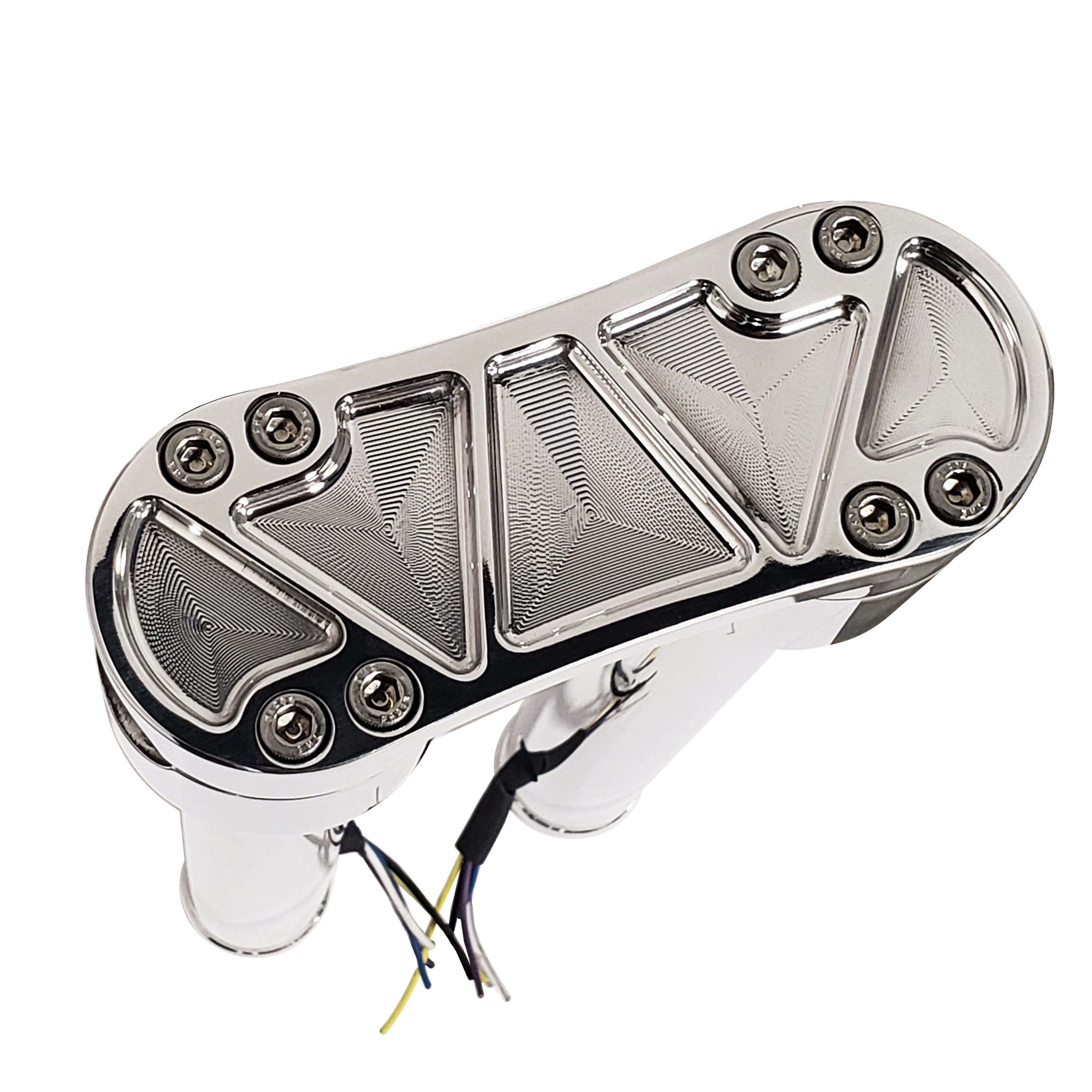 Accutronix Bandit risers fit 1-1/8 ProTaper style handle bars on standard Harley's and many metric bikes. The uniquely designed 8-bolt common top clamp keep the handle bars secure. Drilled for internal wiring and are Tapped for 1/2-13 mounting bolts. These risers are machined from 6061 T-6 Billet Aluminum and are brilliantly Black Anodized or Chrome Plated.